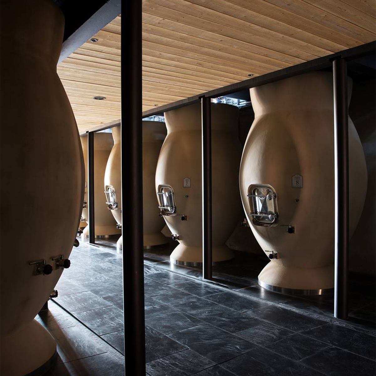 ワイン造りにおいても革新は続きます。重力を活かした醸造、セメントタンクや大樽、アンフォラなど多様な容器を使い分け、テロワールの個性を最大限に引き出すスタイルは唯一無二。過度な抽出や樽香で飾り立てることなく、ブドウ本来の生命力と純度を表現することを重視しています。