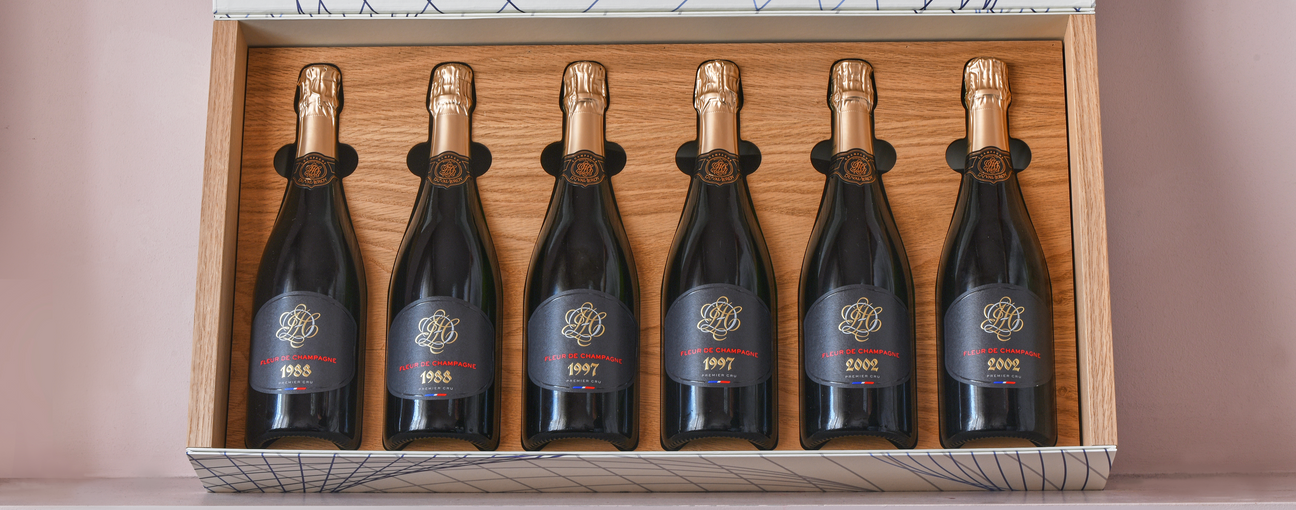 メゾン・デュヴァル=ルロワを象徴するキュヴェ「フルール・ド・シャンパーニュ」の中でも最高品質の3ヴィンテージが各2本ずつ、計6本収められたギフトボックス。